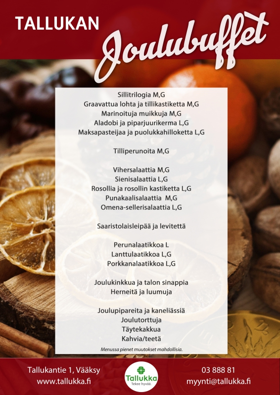 Tallukan pikkujoulupaketit alkaen 62 € / hlö (sis. pikkujoulubuffet ja tanssiliput)