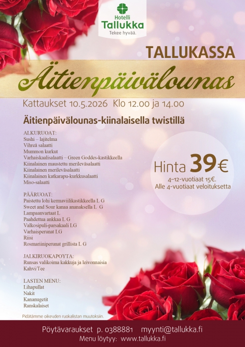 Tallukassa saamme nauttia useiden upeiden artistien esityksistä perinteisissä iltatansseissa, kun Päijännesalin lavallemme saapuu iskelmätaivaan tähtiä viihdyttämään vieraitamme. Iltatanssit tällä hetkellä perjantaisin ja lauantaisin alkaen klo 18.30.